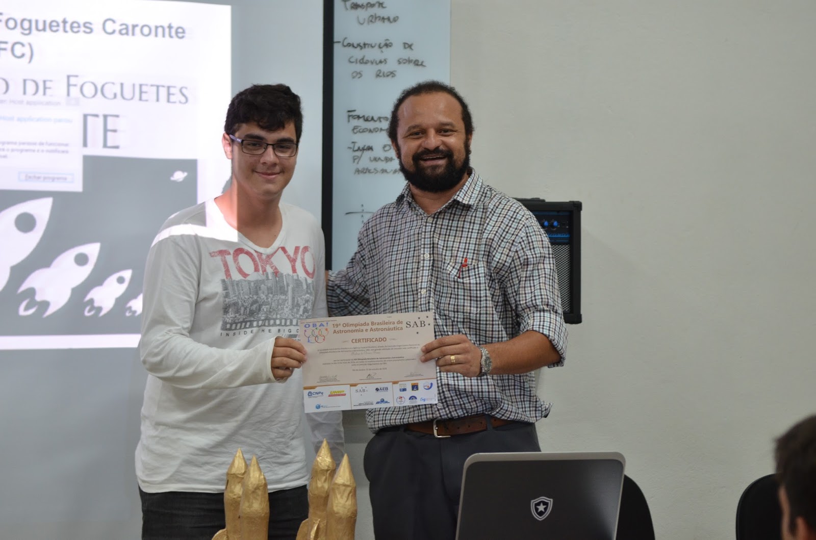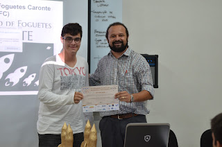 Membro da Equipe do Foguete Jaburu recebendo o troféu de 2o Lugar na CFC