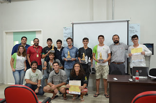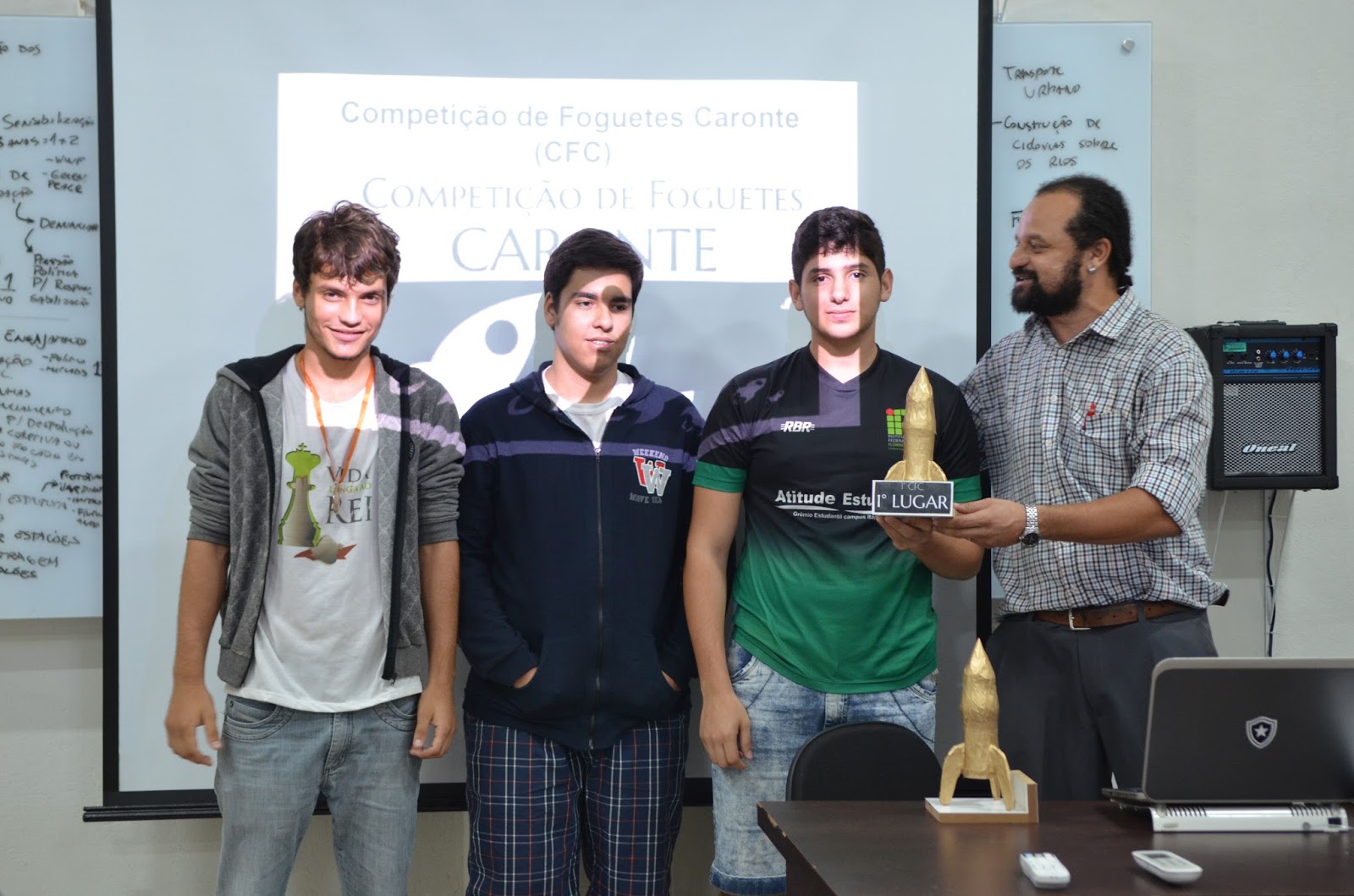 Membros da Equipe do Foguete Titio Coruja recebendo o troféu de 1o Lugar na CFC